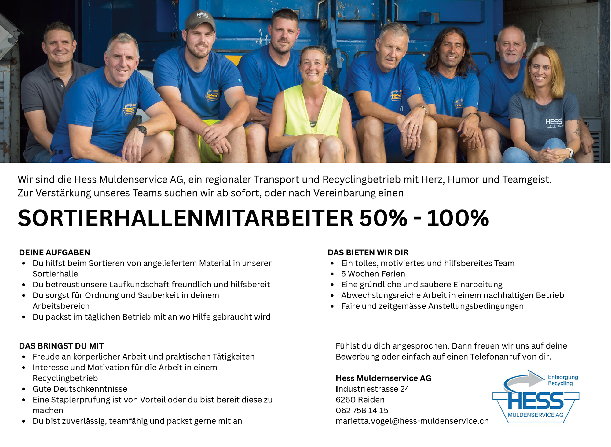 Wir haben die passende Mulde für Ihr Vorhaben und für jeden Zweck. Für Firmen und Private stehen verschiedene Grössen zur Verfügung. Auch der Hess-Bag ist eine interessante Lösung. In der offiziellen Sammelstelle Altlasten beseitigen und gleichzeitig Neues vernehmen – geniessen Sie das stressfreie Entsorgen auch als Treffpunkt für kurze und gute Gespräche. Ganz nach unserer Philosophie: Abfall-Recycling in Perfektion.